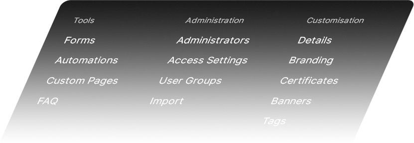 Sign up and manage your customers on their behalf, or enable self signup through customisable store pages. Create individual portals for clients, divisions or products with their own settings and courses.